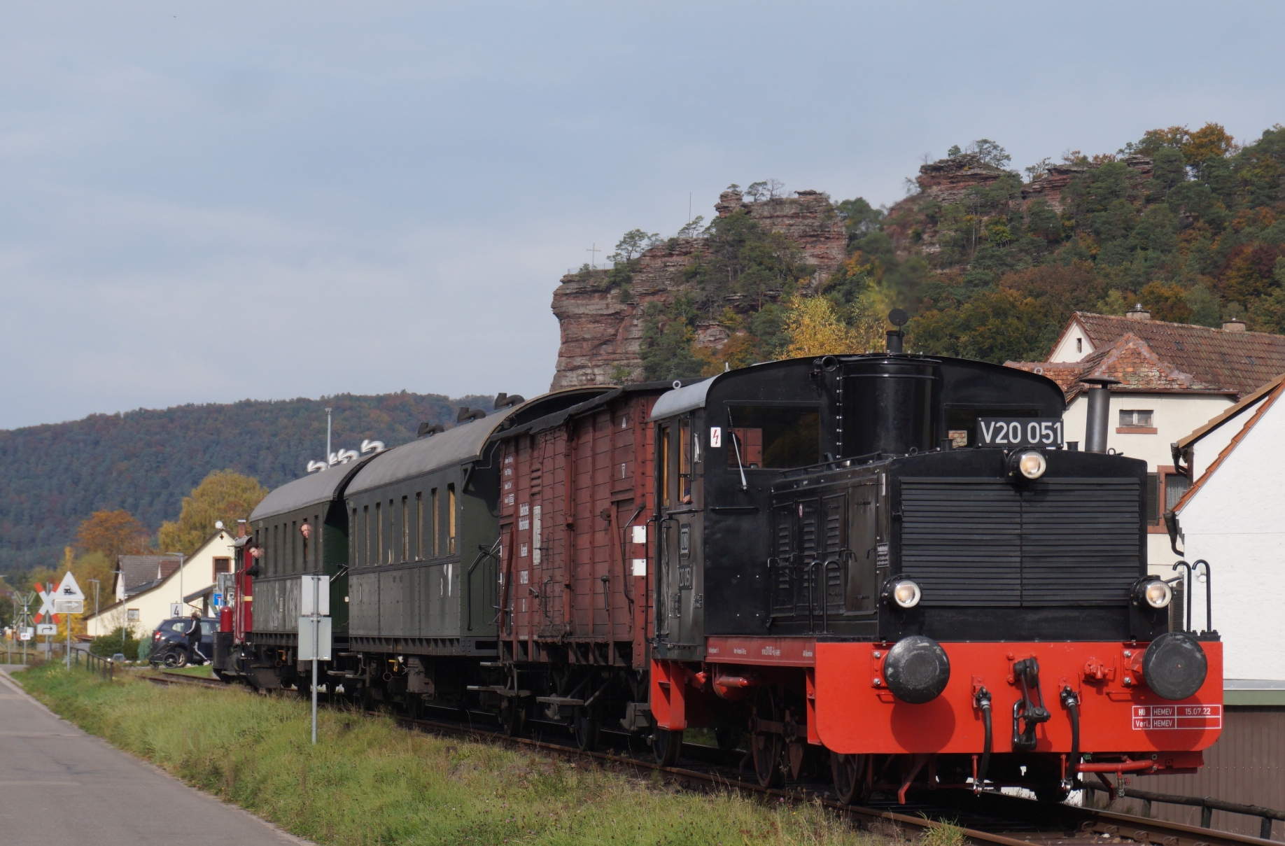 Richtung Bundenthal zieht die Lok V 20 051 des Vereins Historischen Eisenbahn Mannheim, Richtung Hinterweidenthal eine sogenannte Köf 3, sie gehört zum Kuckucksbähnel in Neustadt/W.